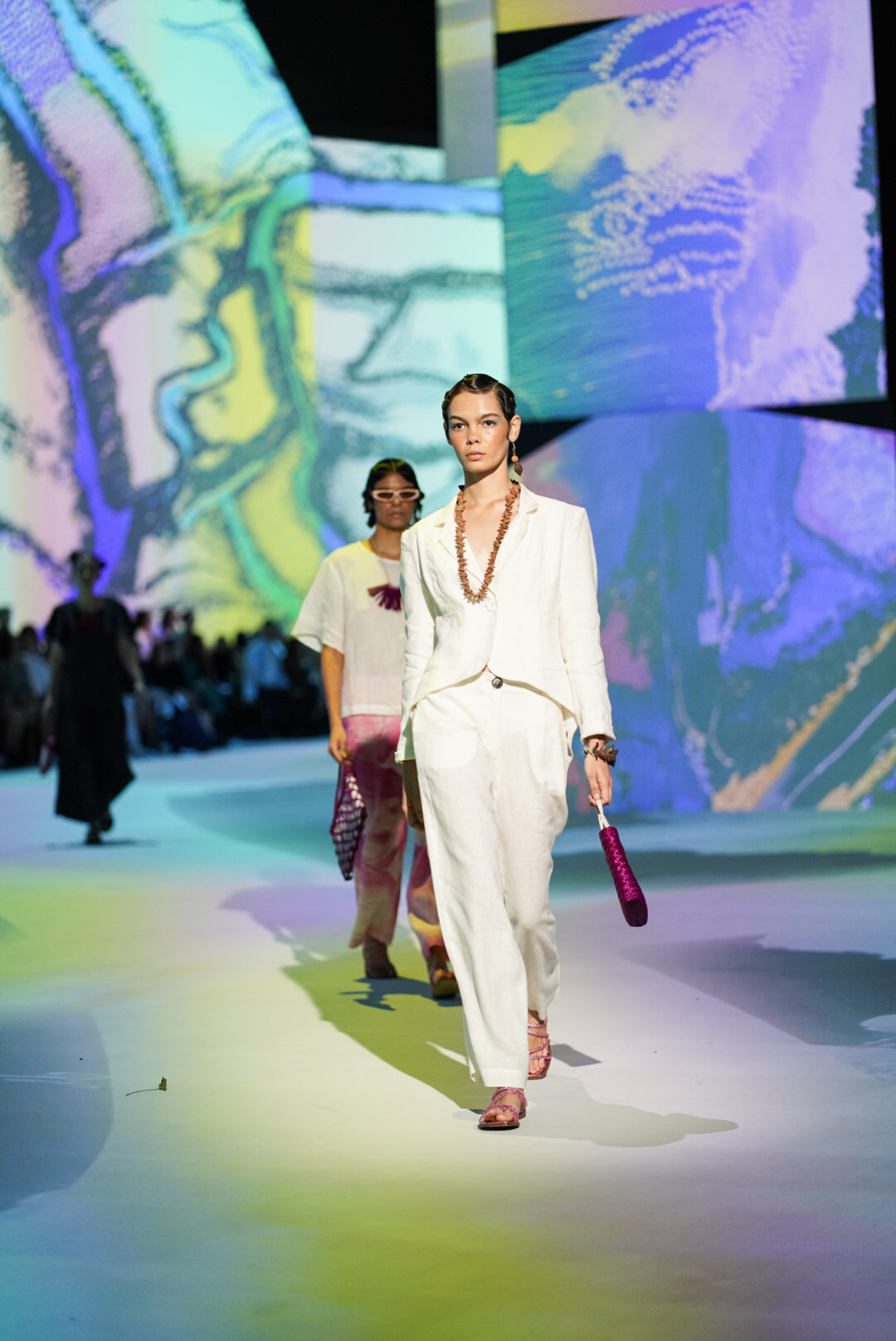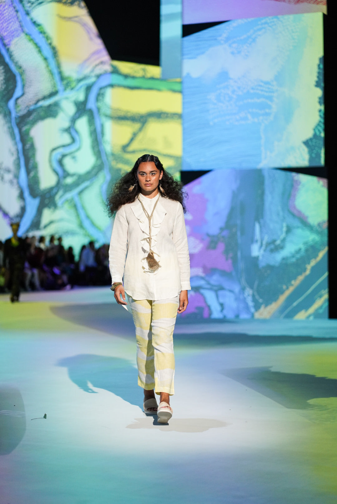 'Sleek cuts meet tactile linens in Wa-ring's collection of tailored blazers, boxy trousers and ‘waterfall’ ruffle blouses. The feminine staples get a sharp modern twist. Designer Annette Sax uses screen printing to transfer ochre paint on canvas, and campfire charcoal pigment on linen textiles adds grit and edge to a tailored look. With fabrications enriched by the land’s natural pigments and textures, Wa-Ring (‘river is kin’) invites wearers to engage with the storytelling and gathering rituals of Taungurung Country.'